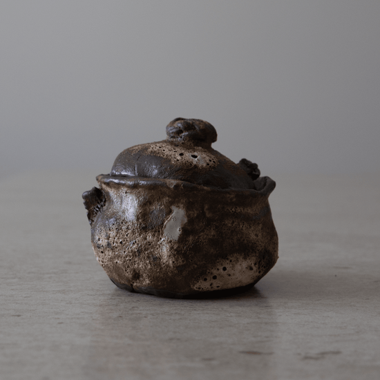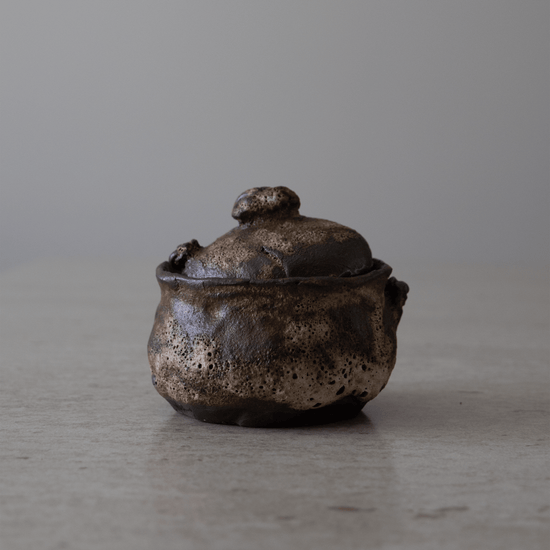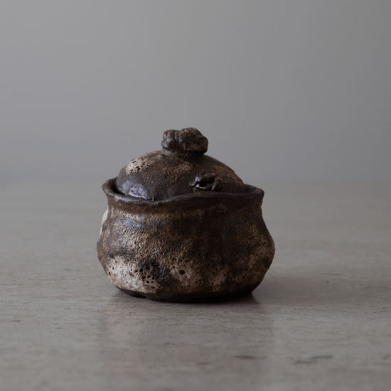 Denne vakre krukken med lokk i sort leire med hvit magma glasur er håndbygget i tre omganger. Formen bygges opp, bearbeides, finjusteres og det endelige uttrykket skapes. Krukken med lokk glaseres i flere lag for et unikt og levende uttrykk.