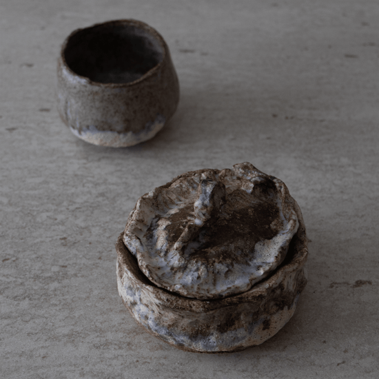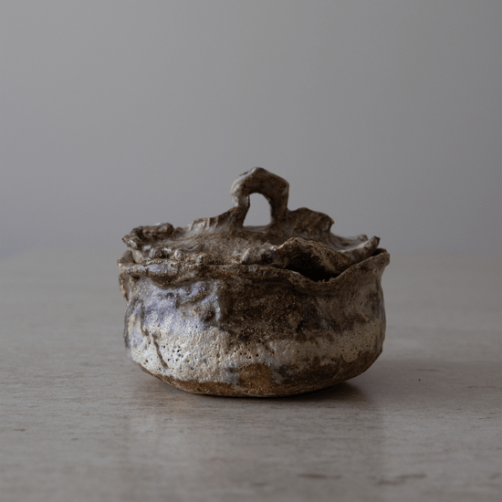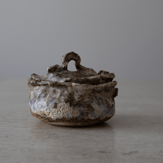 Denne unike og vakre krukken med lokk i blandet leire er håndbygget i tre omganger. Formen bygges opp, bearbeides, finjusteres og det endelige uttrykket skapes. Krukken og lokket glaseres i flere lag for et unikt og levende uttrykk.